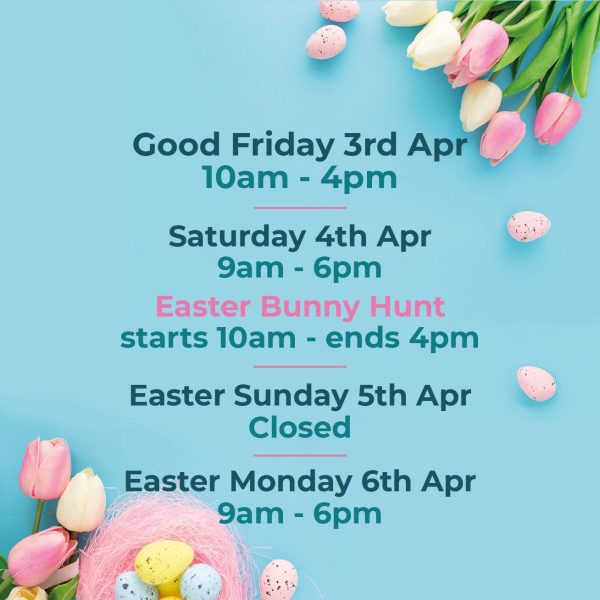 Open 9am – 6pm + Easter Bunny Hunt event 10am – 4pm.