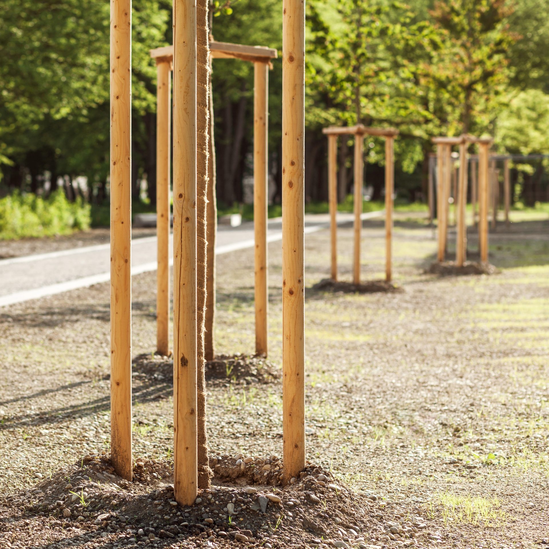 - The Double Stake: Best for larger “standard” trees. Two stakes are driven in vertically on either side of the root ball, with a timber crossbar or two separate ties.