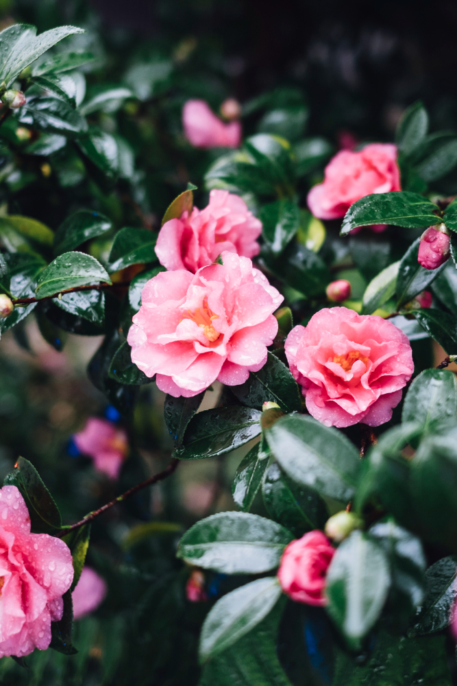 - Camellia japonica: The classic choice with perfectly symmetrical, formal flowers in shades of porcelain white, rose pink, and deep crimson.