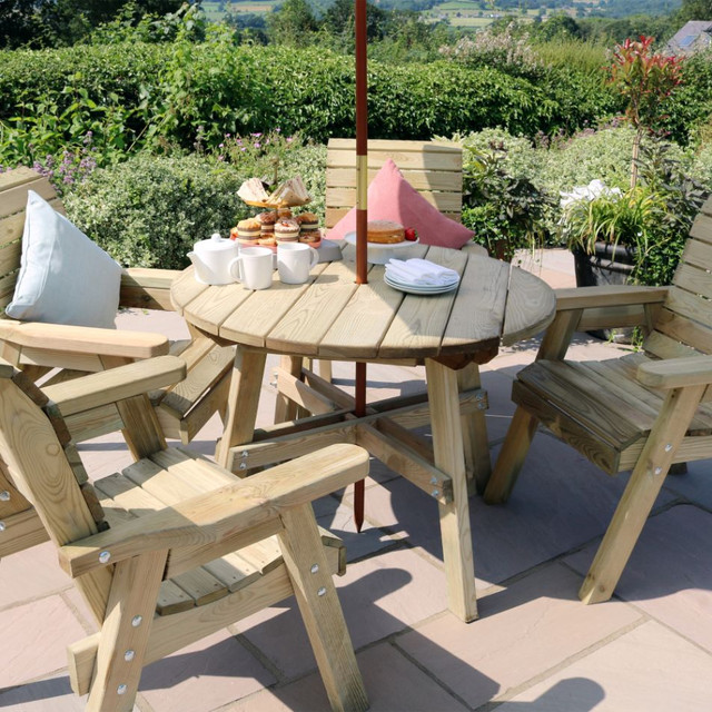 The Charlotte Easy Build round table and 4-chair set combines style and comfort. This easy-to-assemble garden furniture set is perfect for hassle-free outdoor dining.