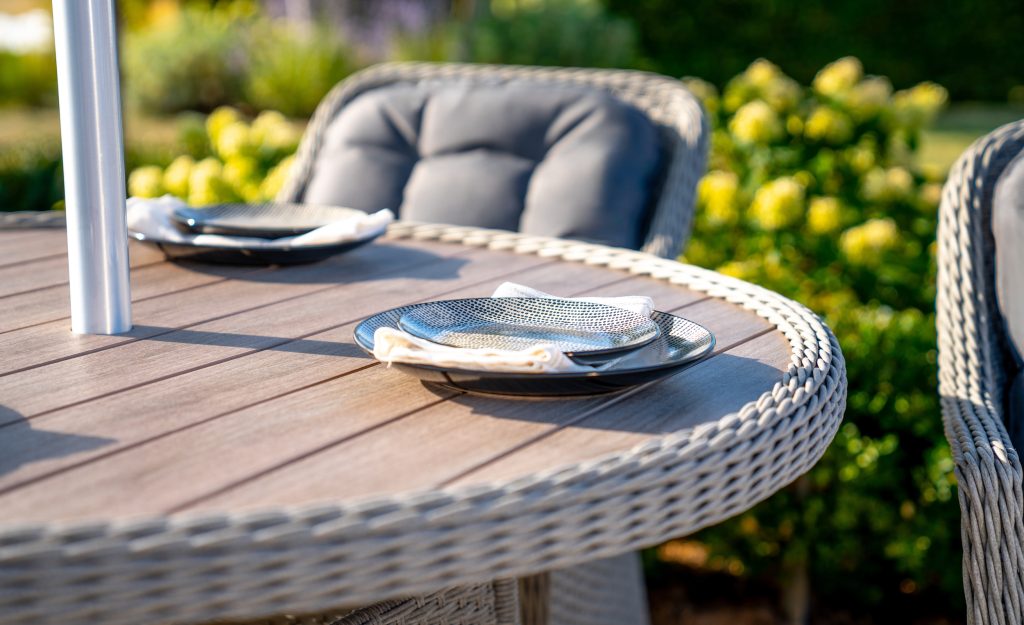 Crafted with a strong powder-coated aluminium frame and finished with 4mm full-round, UV-resistant hand-woven synthetic wicker, the Foxley set delivers durability with an elegant woven look. The sunk slatted tabletop creates a stable, flat surface, while adjustable feet help level the table on uneven ground. Finished with RainSafe cushions that dry faster after showers, this low-maintenance set is ideal for effortless outdoor dining throughout the season.