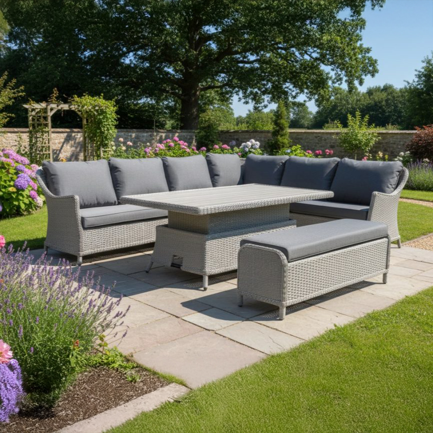 The set includes a spacious corner sofa, a matching bench, and a rectangular height-adjustable table with a sunk slatted top, allowing you to move effortlessly between coffee and dining height. Crafted with a strong powder-coated aluminium frame and finished in 4mm full-round, UV-resistant hand-woven synthetic wicker, it’s built for durability and low maintenance. Finished with RainSafe cushions that retain their shape and dry faster after showers, this set offers comfort and practicality throughout the outdoor season.