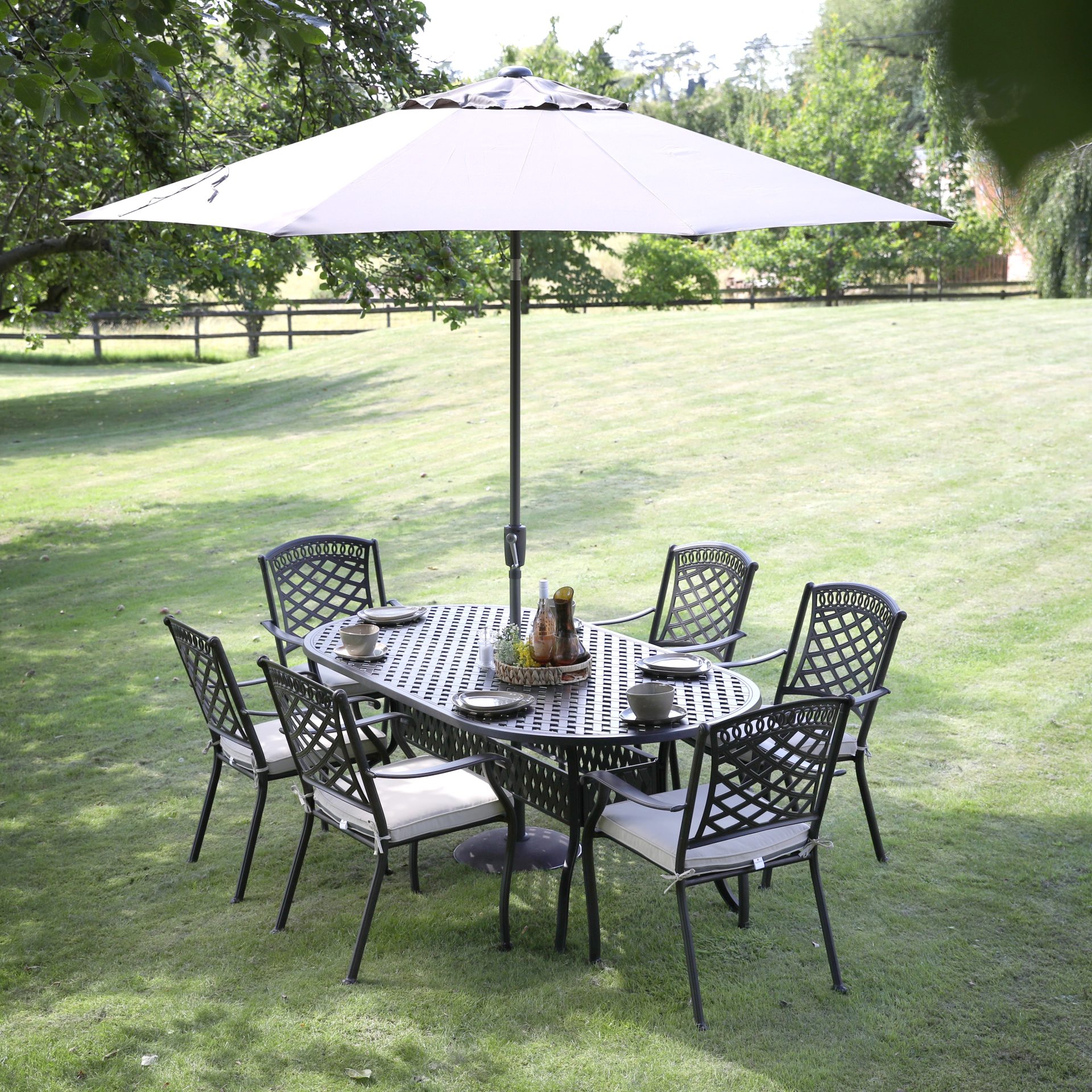 This Pescara garden furniture set comprises: 6 x Pescara garden dining chairs in Bronze Charcoal with cushion pads; 1 x Pescara dining table in Bronze Charcoal.
