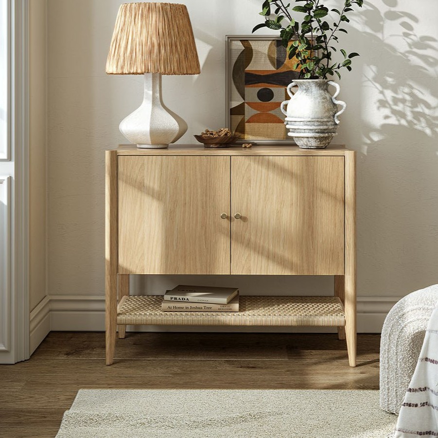 The Sicily Collection brings a refined blend of natural warmth and modern craftsmanship to living and dining spaces. Each piece is finished in a soft light oak lacquer that highlights the beauty of the wood grain, while woven accents – featured on shelves, door fronts, or seat surfaces – add inviting texture and artisan character. Thoughtful details such as brass hardware introduce a subtle touch of elegance, balancing the collection’s organic materials with a contemporary edge.