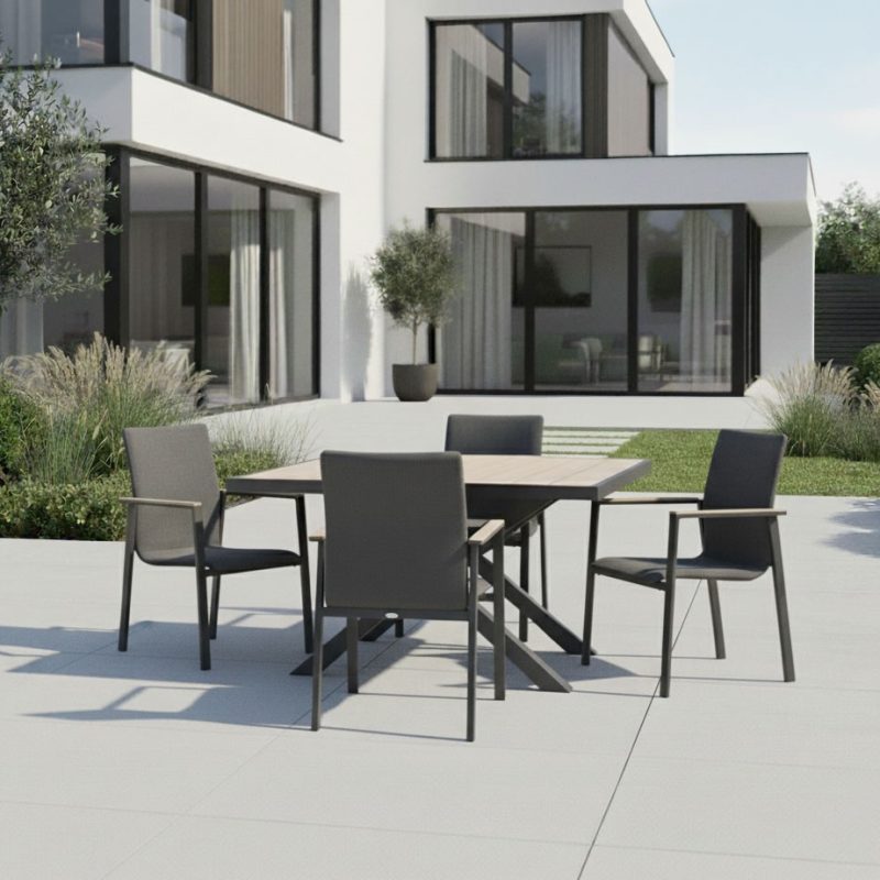 The Tudor garden furniture collection features modern designs with aluminium frames, Eco Wood tabletops that look like real wood but require no maintenance, and weatherproof cushions. This set consists of: 4x Tudor Stacking Chairs, 1x 90x90cm Square Dining Table